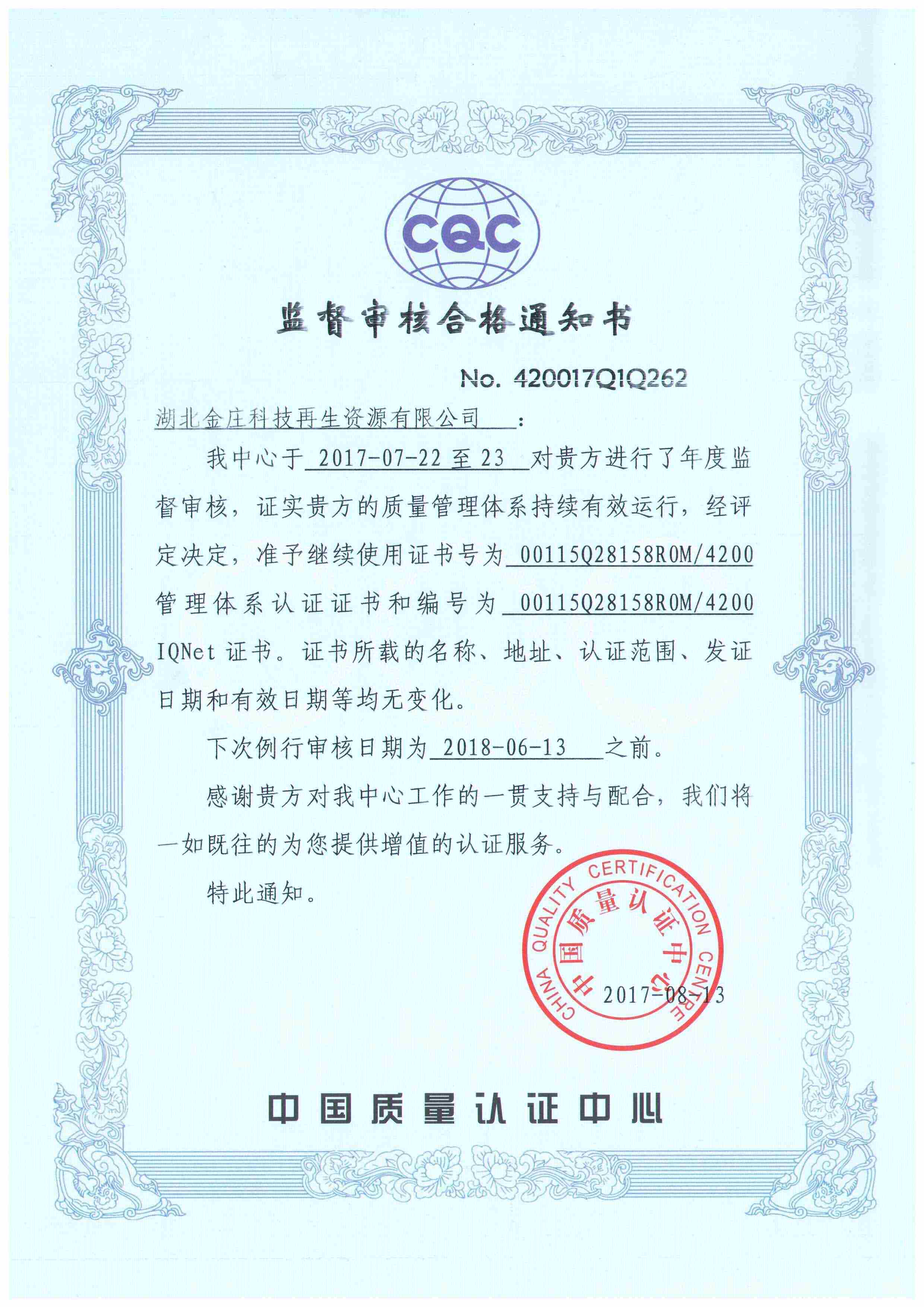 2017年質(zhì)量管理體系監(jiān)督審核合格通知書(shū)